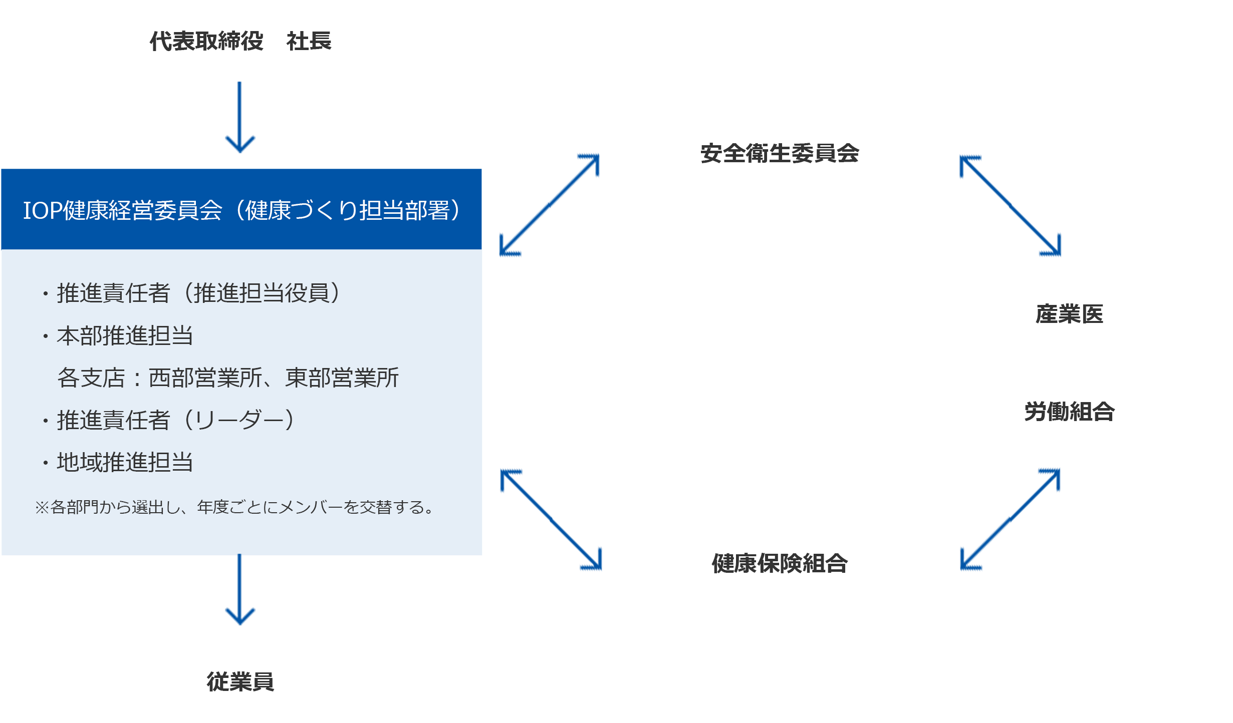会社健康づくり担当部署+産業医+安全衛生委員会+労働組合+健康保険組合の参加